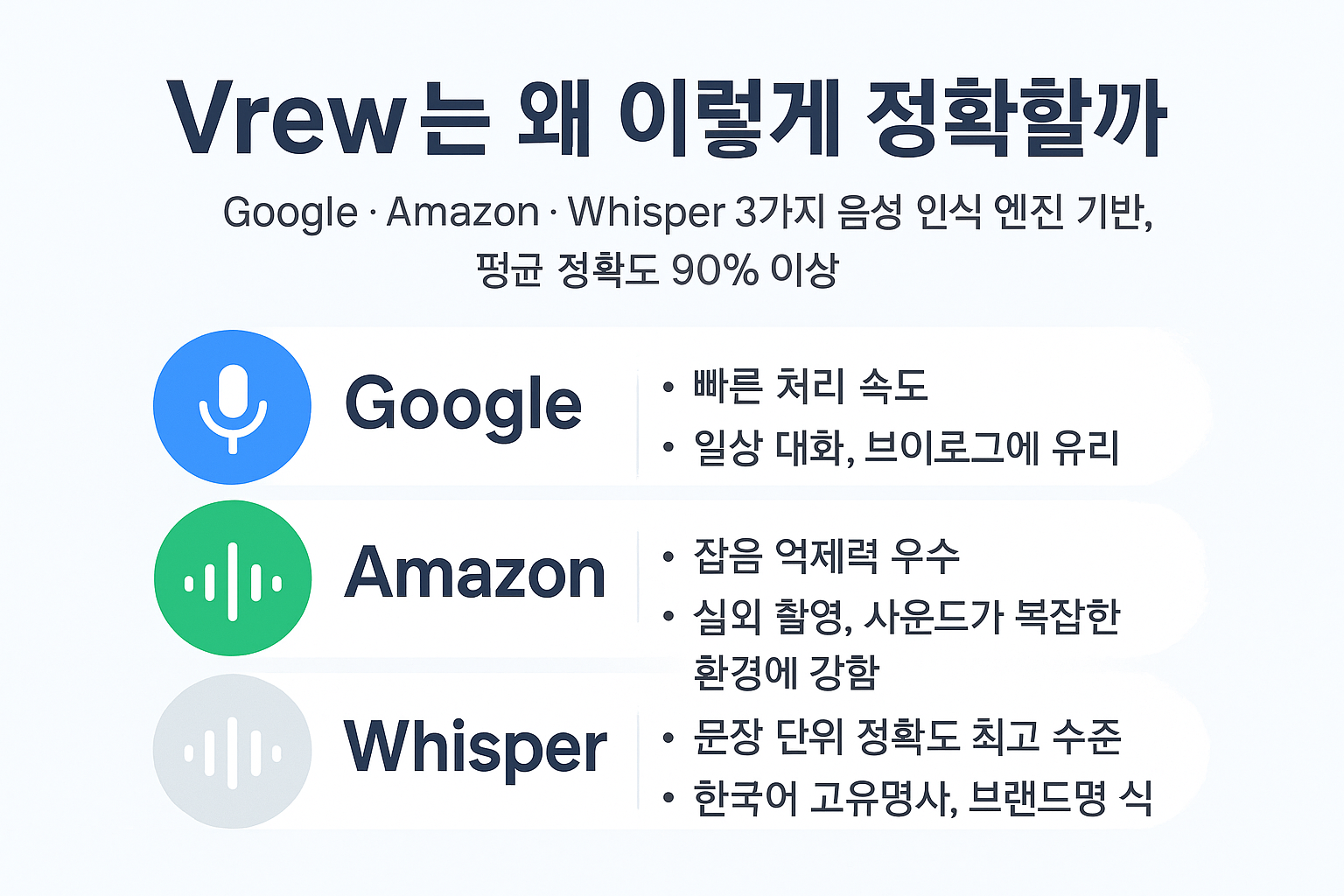 정확도를 극대화하려면 조용한 환경에서 외장 마이크로 녹음하고, 평소보다 천천히 명료하게 발음하세요. Google, Amazon, Whisper 3가지 엔진 중 영상 특성에 맞는 엔진을 선택하면 3~5% 추가 향상이 가능합니다.