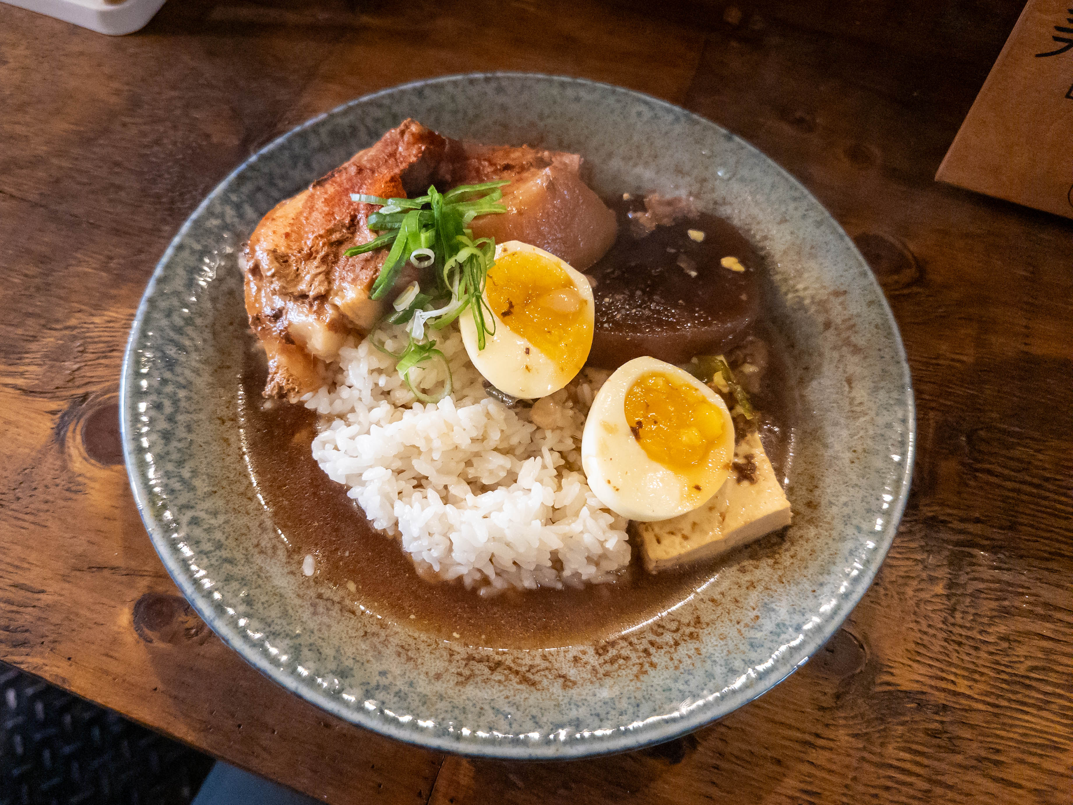 덮밥으로 주문하면 따뜻한 밥 위에 조림이 듬뿍 올라오고, 반숙 계란과 파채가 고명으로 올라갑니다. 고기와 밥을 함께 한 입 떠서 먹으면 꿀맛이죠. 밥양도 넉넉해서 성인 남성도 충분히 배부르게 먹을 수 있는 양입니다.
